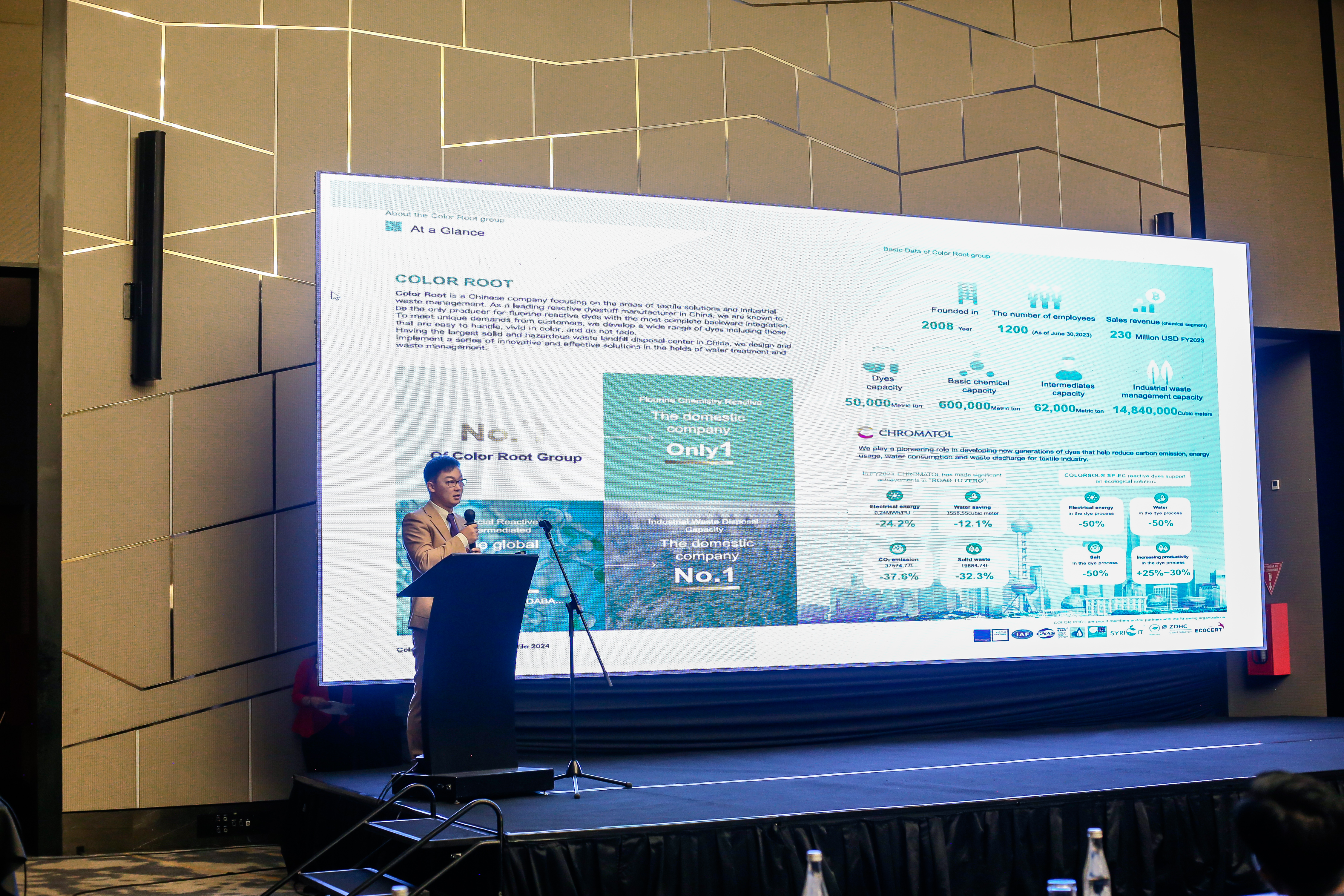 Then, Liu Zixuan, Director of Color Root, played our environmental protection promotional video to all the audience and introduced the basic profile and sustainable development strategy of Color Root Group, and elaborated on the reasons for choosing Rudolf Indonesia to carry out in-depth cooperation on reactive dyes in Indonesia.