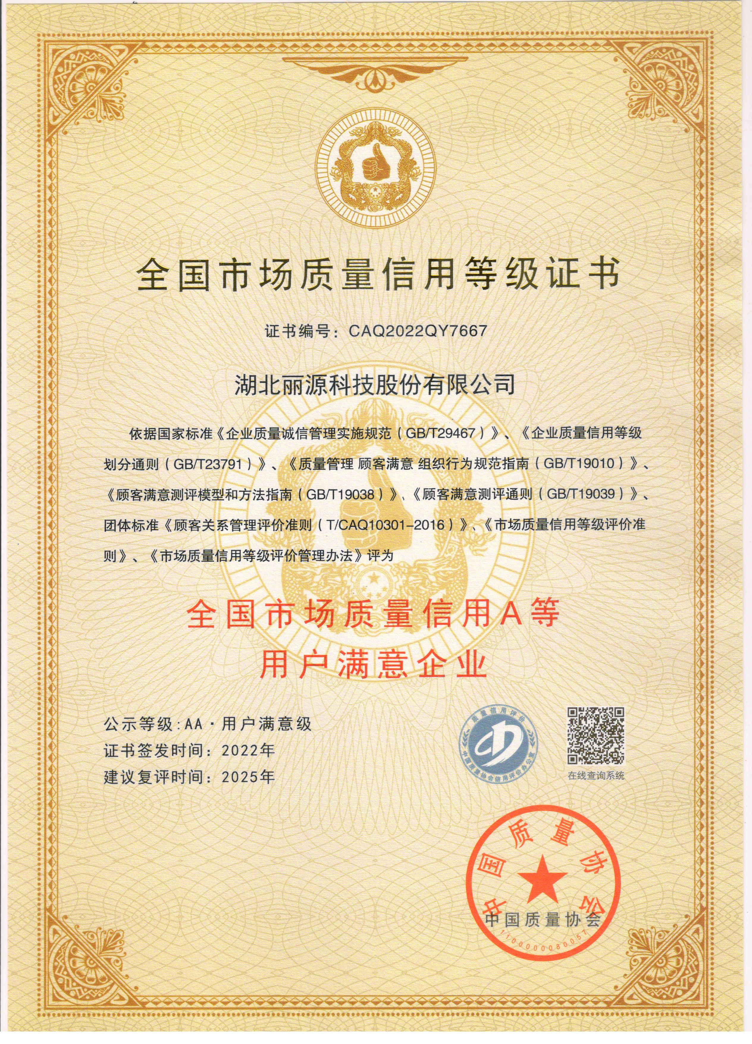 2016年11月,麗源科技首次獲得中國質(zhì)量協(xié)會(huì)頒發(fā)的「全國市場質(zhì)量信用用戶滿意企業(yè)」(每3年復(fù)評一次)