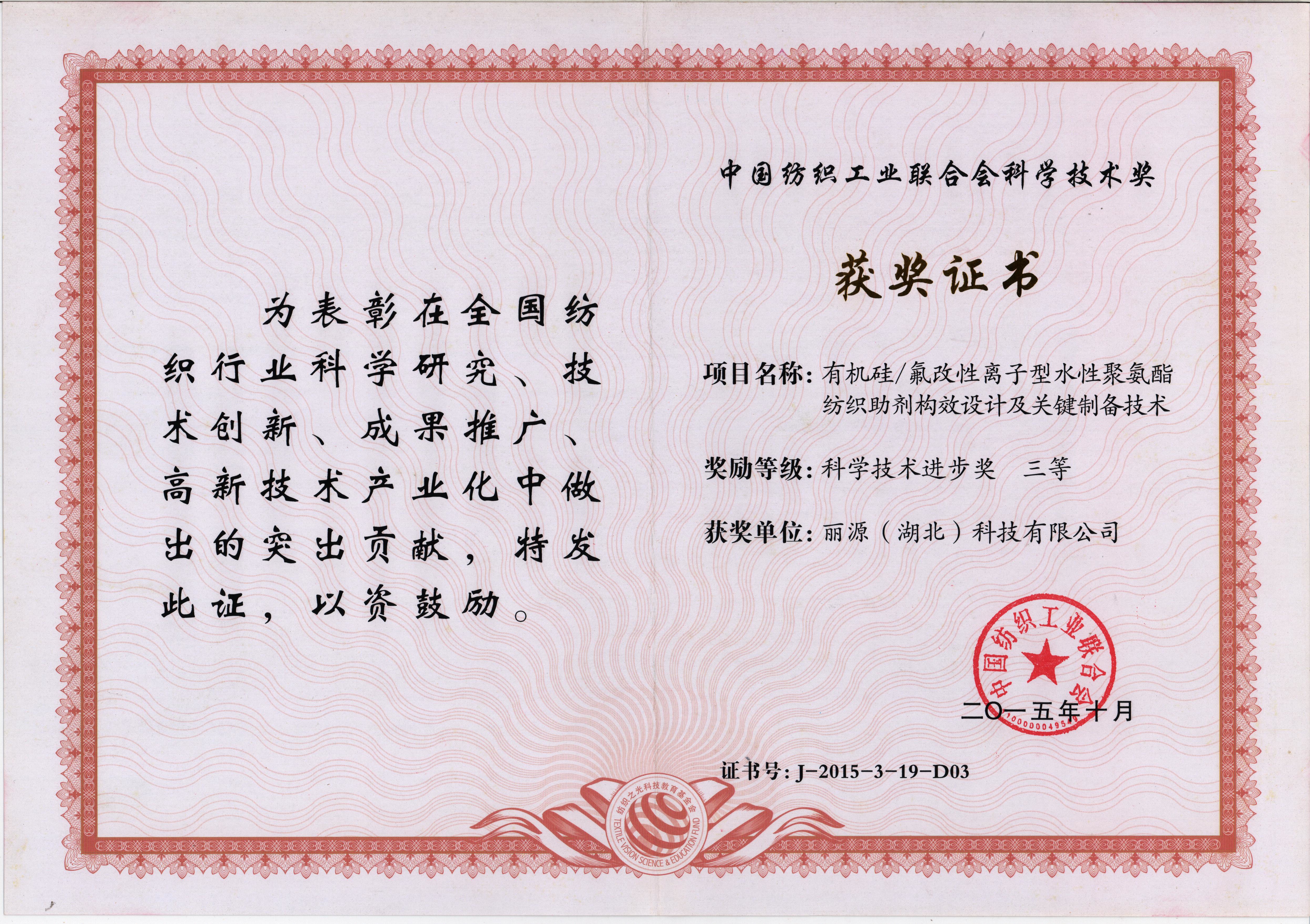 2015年10月,麗源科技有機(jī)硅、氟改性離子型水性聚氨酯紡織助劑構(gòu)效設(shè)計(jì)及關(guān)鍵制備技術(shù)獲得由中國紡織工業(yè)聯(lián)合會(huì)頒發(fā)的 「科學(xué)技術(shù)進(jìn)步獎(jiǎng)三等獎(jiǎng)」