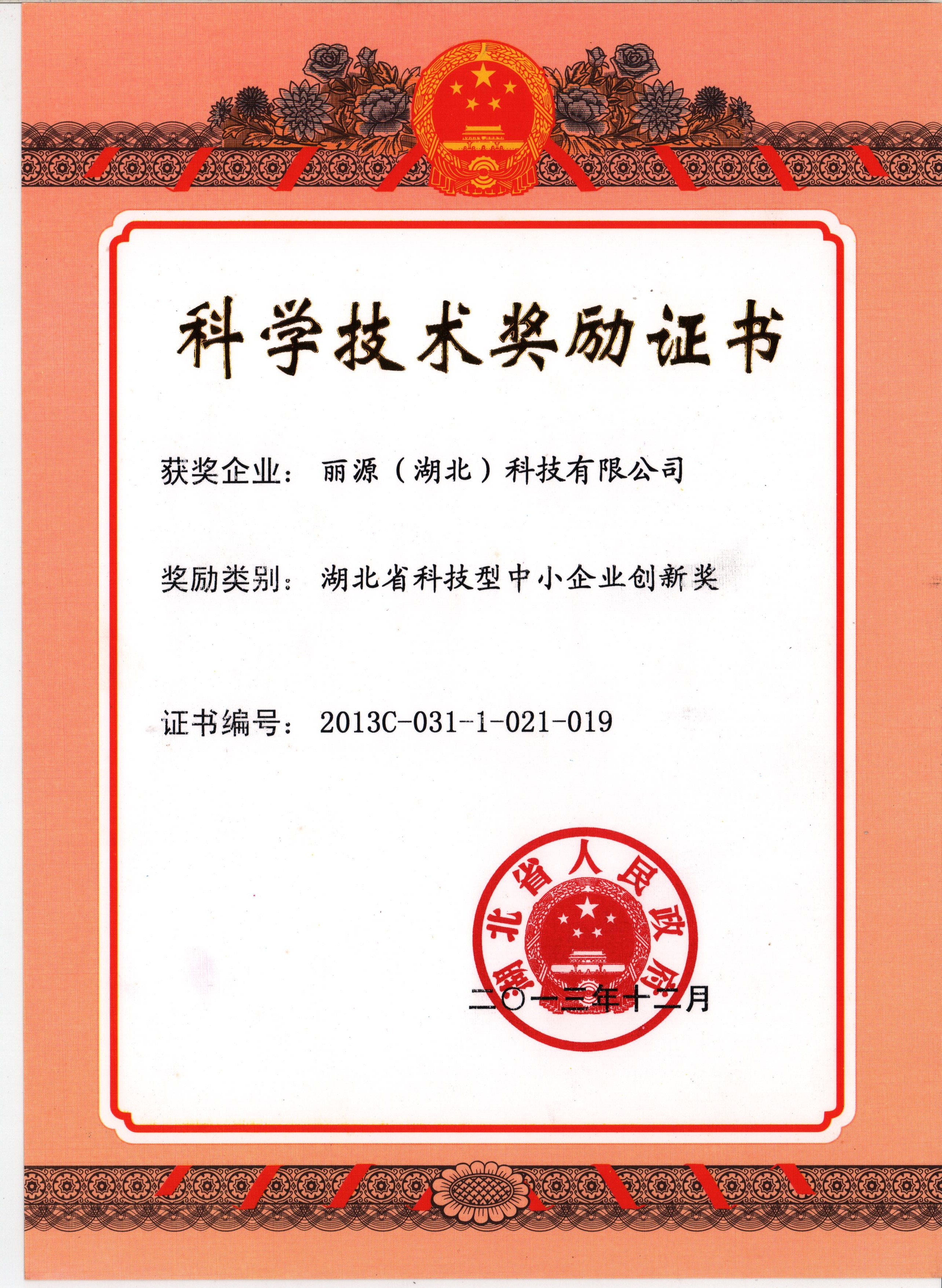 2013年12月,麗源科技獲得由湖北省人民政府頒發(fā)的「湖北省科技型中小企業(yè)創(chuàng)新獎(jiǎng)」