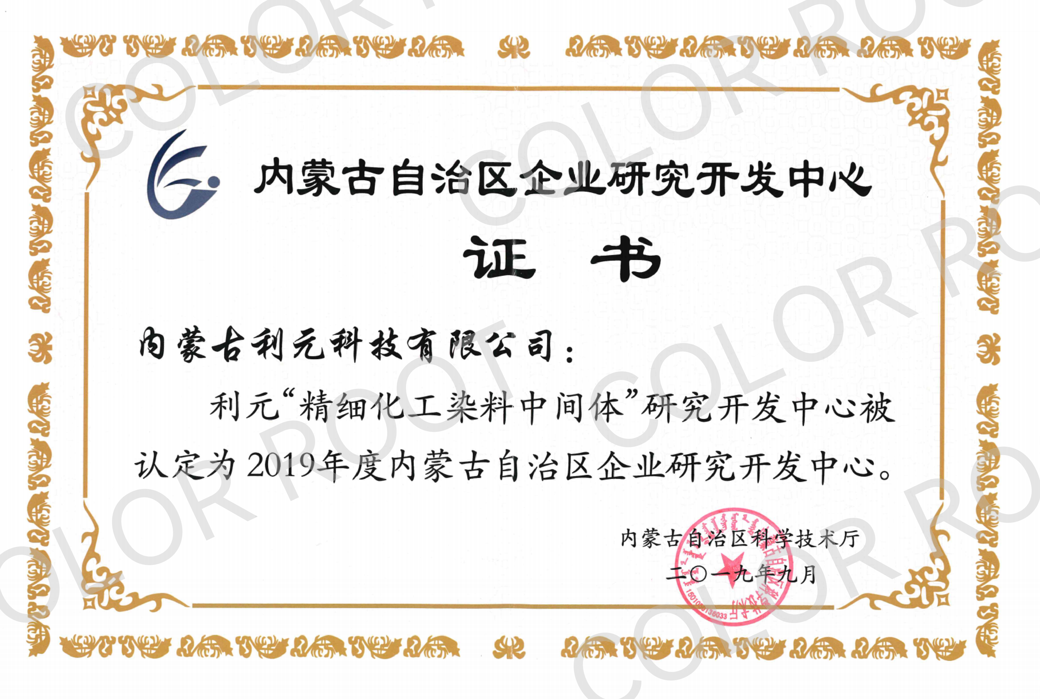 2019年9月,內(nèi)蒙古利元“精細(xì)化工染料中間體”研究開發(fā)中心被認(rèn)定為內(nèi)蒙古自治區(qū)企業(yè)研究開發(fā)中心